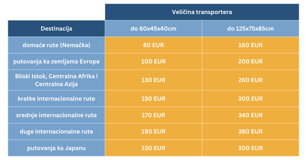 Evo i kako izgledaju cene za doplatu transportera sa jednim ili dva ljubimca koje želite nositi sa sobom u kabinu: